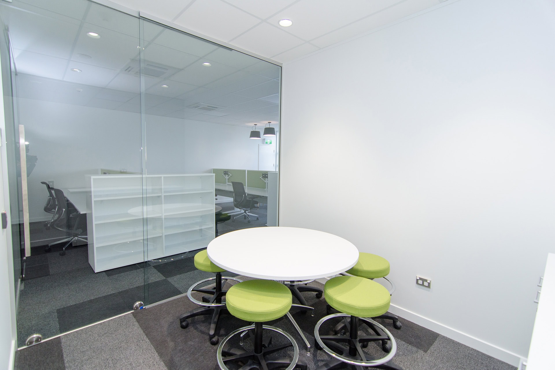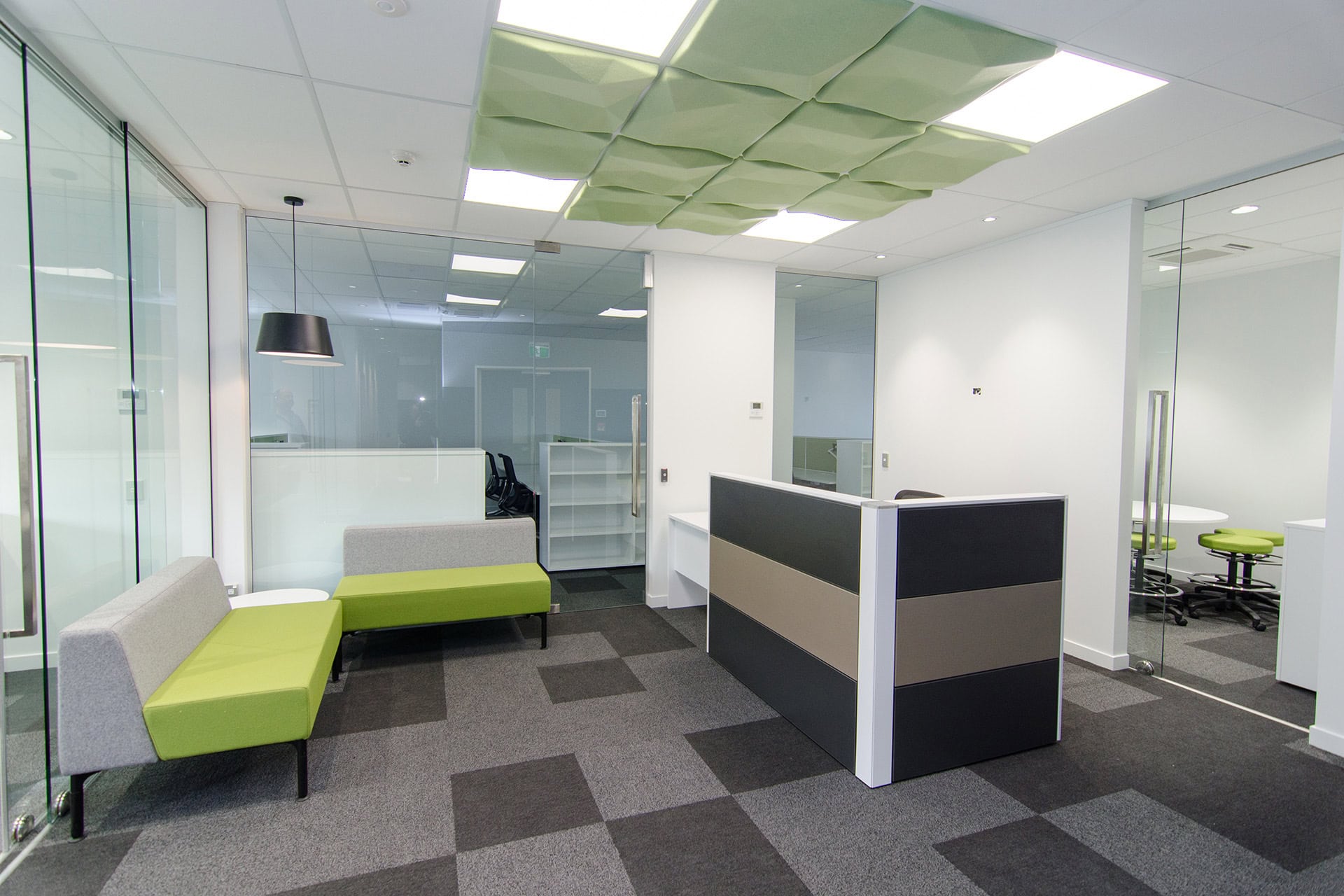 The office layout includes multiple meeting rooms to accommodate private discussions, client meetings, and well-appointed offices for staff. Including several bathrooms ensures convenience and accessibility for both employees and visitors. Aesthetically, the firm opted for cool, neutral colours throughout the workspace to maintain a professional and calm atmosphere. Accents of lime provide vibrant splashes of colour, injecting energy and a modern feel to the office design, reflecting the firm’s dynamic and innovative approach to business.