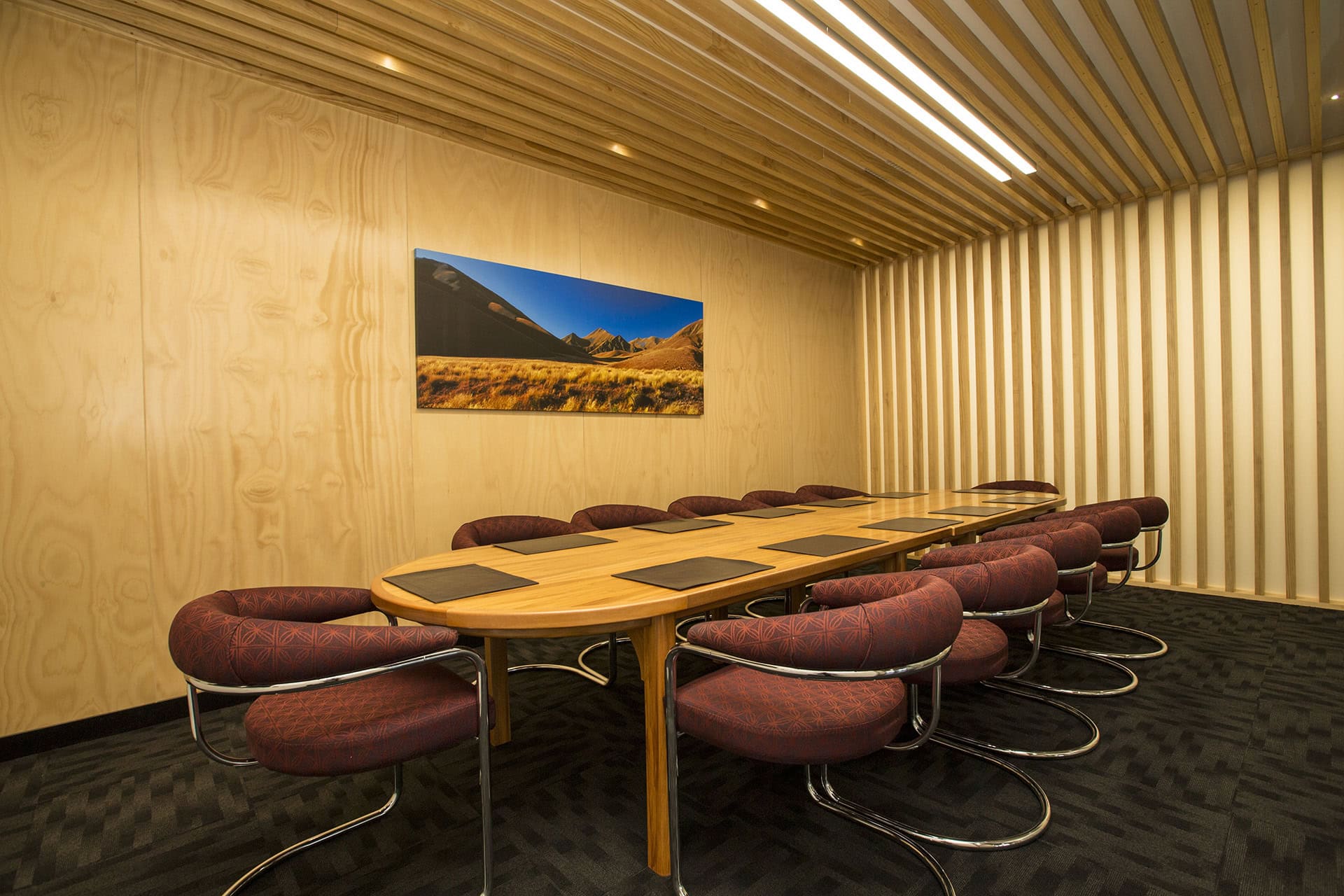 We worked throughout to incorporate a sense of diversity – utilising strong contrasting colours and materials. Textural tartan flooring patterns as well as timber slatted walls and ceilings connected with Timpany Walton’s strong rural client base.